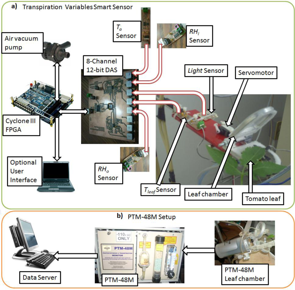 The experimental setup can be seen in Figure 7, which shows the development of a smart sensor setup and the commercial Phytech PTM-48M, see Figure 7a and Figure 7b used for performance comparisons. For this experiment, tomato (Lycopersicon esculentum) plants were chosen as biological material to measure transpiration responses in the proposed smart sensor testing. The proposed smart sensor consists on an instrumentation platform capable of measuring Ta, Tleaf, RHi, RHo and Light. To measure temperature readings, Honeywell Pt1000 RTD primary sensors were used which have a measurement range from −200 °C to 540 °C, but are configured for a 0 to 65 °C range with an accuracy rate of ±0.3 °C considered suitable for plant temperature ranges [10]. A RTD-signal conditioning system was developed to convert the resistance variation into a 0 to 5 volt format. For RH measurements, Honeywell HIH-4000 capacitive RH sensors with a range from 0 to 95% RH and accuracy of ±2.5% were selected and connected through a developed RH-signal conditioning system [11]. Ambient light measurement is achieved by using an OSRAM SFH-5711 light sensor with range from 0 to 100,000 lux and an accuracy of ±0.04% of its measured value, providing a 0 to 50 μA current signal [25], converted into 0 to 5 V by a designed light-signal conditioning system. The results are suitable in order to measure light intensities in rooms from total darkness to complete sunlight. Each primary sensor reading passes through a 2nd order analog anti-alias LPF with 20 Hz cut-off frequency embedded in the proposed smart sensor. An eight channel 12-bit data acquisition system based on the Burr Brown ADS7844 analog to digital converter instrumentation platform was developed to read the primary sensors [26]. An FPGA based hardware digital signal processing unit was utilized to compute the transpiration response variables from the primary sensors readings based on an Altera Cyclone III EP3C16F484C6N device with 16,000 LE [27]. For the open/close leaf chamber mechanism, a miniature servomotor model E-Sky 000155 was utilized because of its low power consumption. The air flow was induced using a dc-motor piston based vacuum pump. The FPGA IP core was implemented in VHDL language, integrating the DAS driver, leaf chamber motors control, signal processing unit and communications blocks.