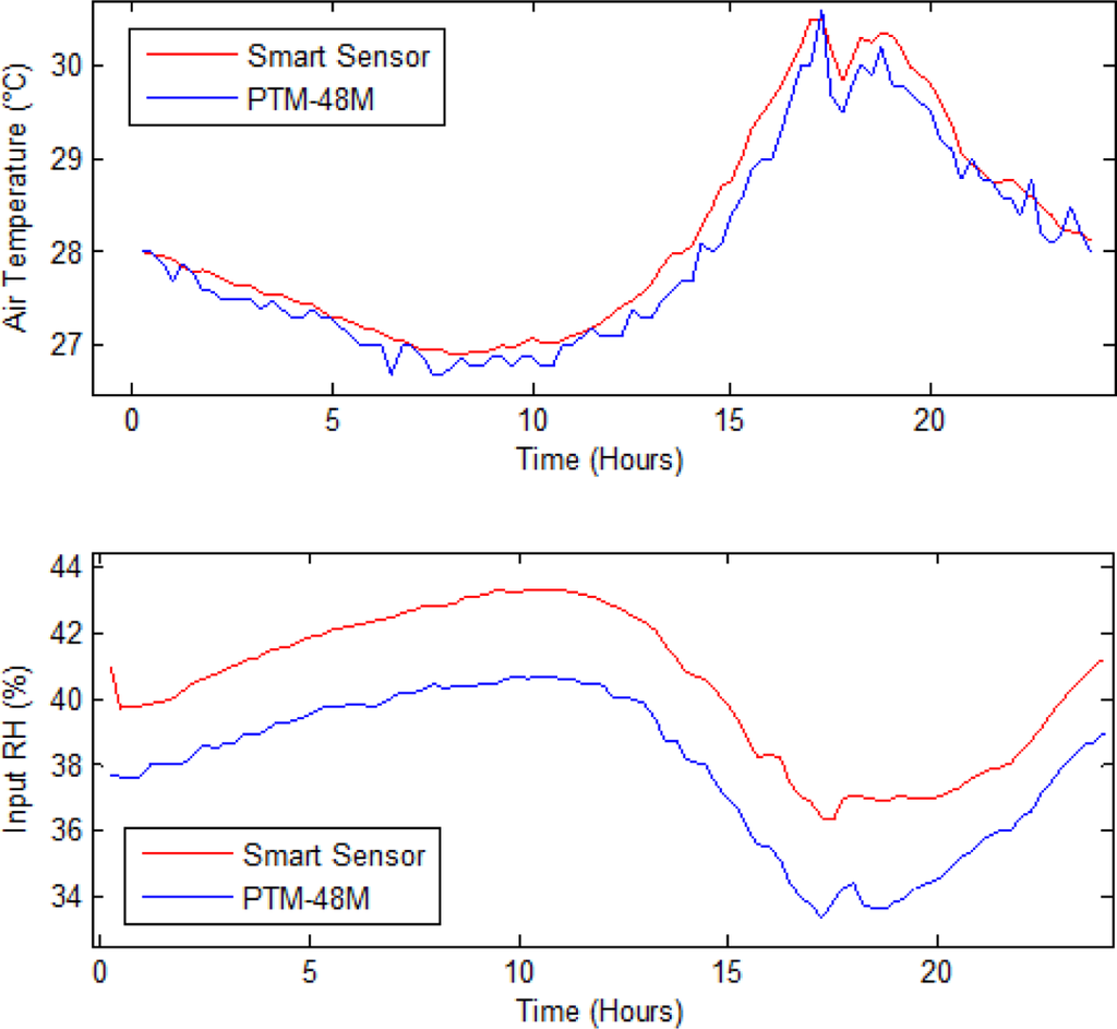 In this subsection, a comparison between the Ta and RHi readings from the proposed smart sensor and the commercial PTM-48M is presented. Figure 8 illustrates this comparison where blue signals correspond to PTM-48M readings and red ones to the proposed smart sensor primary readings. Here, it can be noted that a similar tendency occurs for both measurements, but a lower amount of noise in the red signals is present due to the 64-sample average decimation filters and 1st order IIR filters that reduces undesirable variations. In this manner, the filtering advantages of the smart-sensor signal processing can be clearly noticed. RHo, Tleaf, and Light readings are not compared because PTM-48M does not provide RHo measurement in the data output table and does not have Tleaf and Light sensors.