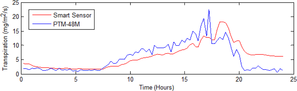 Comparison between the developed smart sensor and the PTM-48M transpiration estimations.