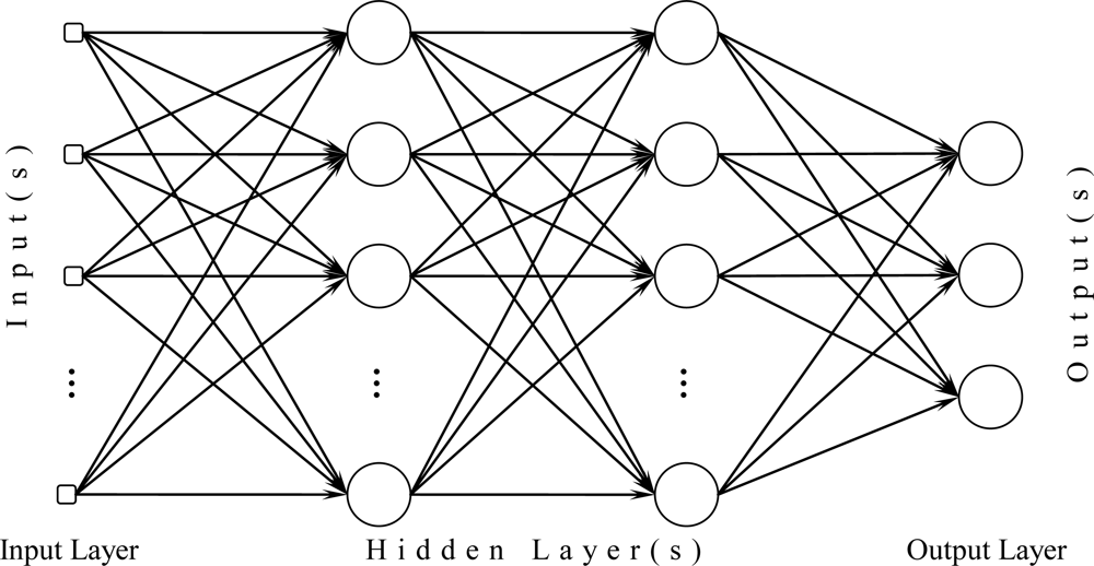 The input variables are transferred via the neurons at the input of the network. This group of the neurons is called input layer while the neurons producing of the network responses at the output are called output layer. An MLP network also includes one or more hidden layers between the two layers. In most nonlinear problems, two or more hidden layers improve the generalization ability of the network [13].