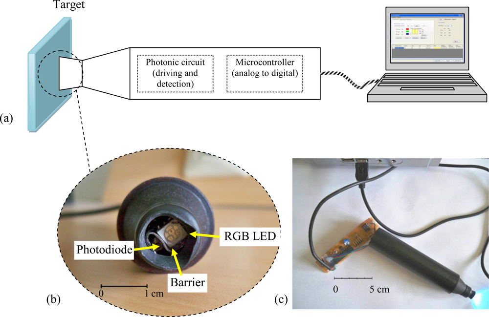 (a) Schematic illustration of RGB LED based color. (b) Photo of sensor tip. (c) Sensor probe connected with PC.