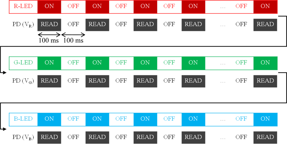 The sensor uses RGB LEDs controlled by a microcontroller as the light source. A photodiode converts the optical signal reflected from the target into analog voltages. Then the microcontroller converts analog voltages into digital data and sends to computer after completion of a measurement cycle. This digital data is utilized to determine R, G, and B values, since the reflected intensity (i.e., diffuse reflection) is proportional to RGB content of the target. Figure 4 describes how the measurement cycle completes.