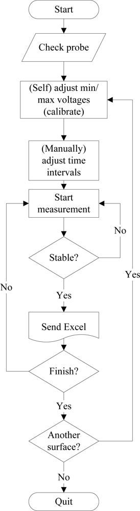 The cycle starts checking out whether the device is connected with PC. Then, minimum and maximum analog voltages produced by the probe are determined to calibrate the probe according to the properties of the surface to be measured. Minimum and maximum voltages are obtained from black and white colored surfaces, respectively. After calibration, the automatic measurement intervals are selected for each LED to be driven and the photodiode to be read. Time intervals are selected as 100 ms in this work. Microcontroller then drives R-LED during a duty-cycle of 100 ms as first and reads the photodiode’s output at the same time (Figure 3). This step is repeated averagely by 10 times until readouts remain stable. After completion of the R-LED period the microcontroller sends the readouts to the PC and initiates the G-LED period, and so on. When the three periods complete, (i) a new period can be started on the same surface, (ii) a new measurement can be started on another surface, or (iii) the procedure can be ended. A typical readout in terms of analog voltages and corresponding RGB contents is given in Table 1.