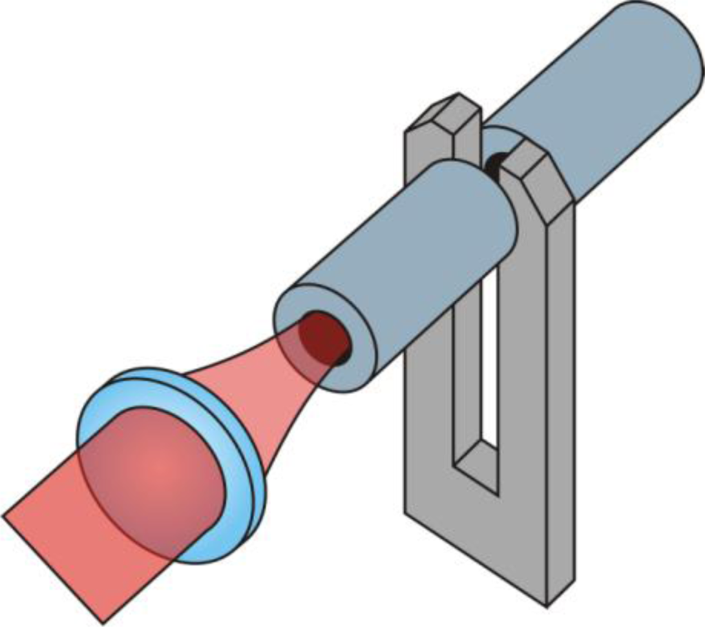 Illustration of a QEPAS spectrophone. The light is focused through the acoustic resonator tubes and the prongs of the tuning fork.
