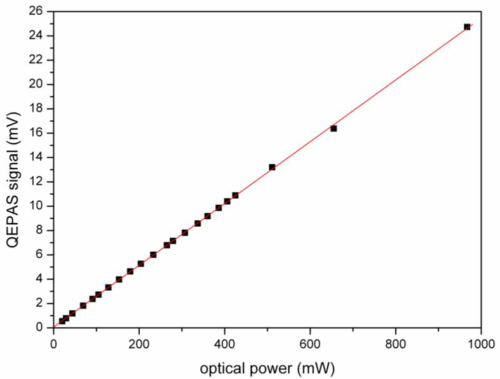 The tapered amplifier has two main effects on the measurement. First, it enhances the photoacoustic signal according to Equation (1), i.e., the QEPAS signal increases linearly with the incident optical power. Figure 3 shows a QEPAS measurement at different optical powers; the linear dependence is clearly visible. Despite the high power of the laser, no offset was experienced which indicates that the alignment through the spectrophone is acceptable.