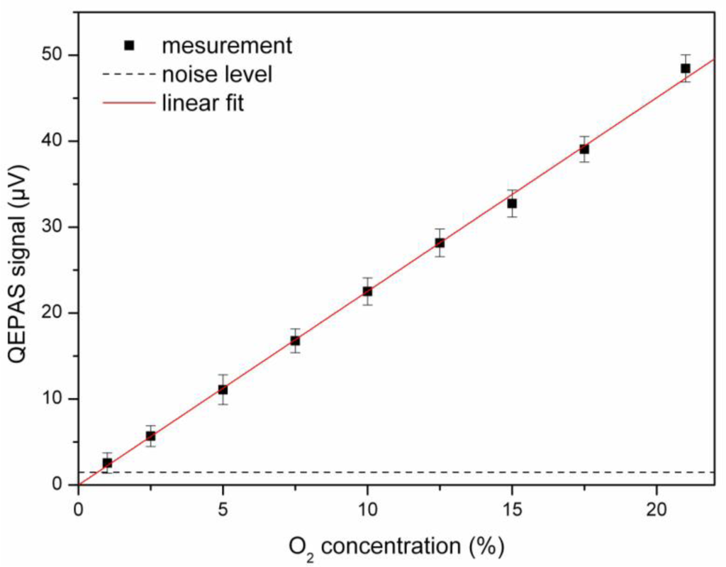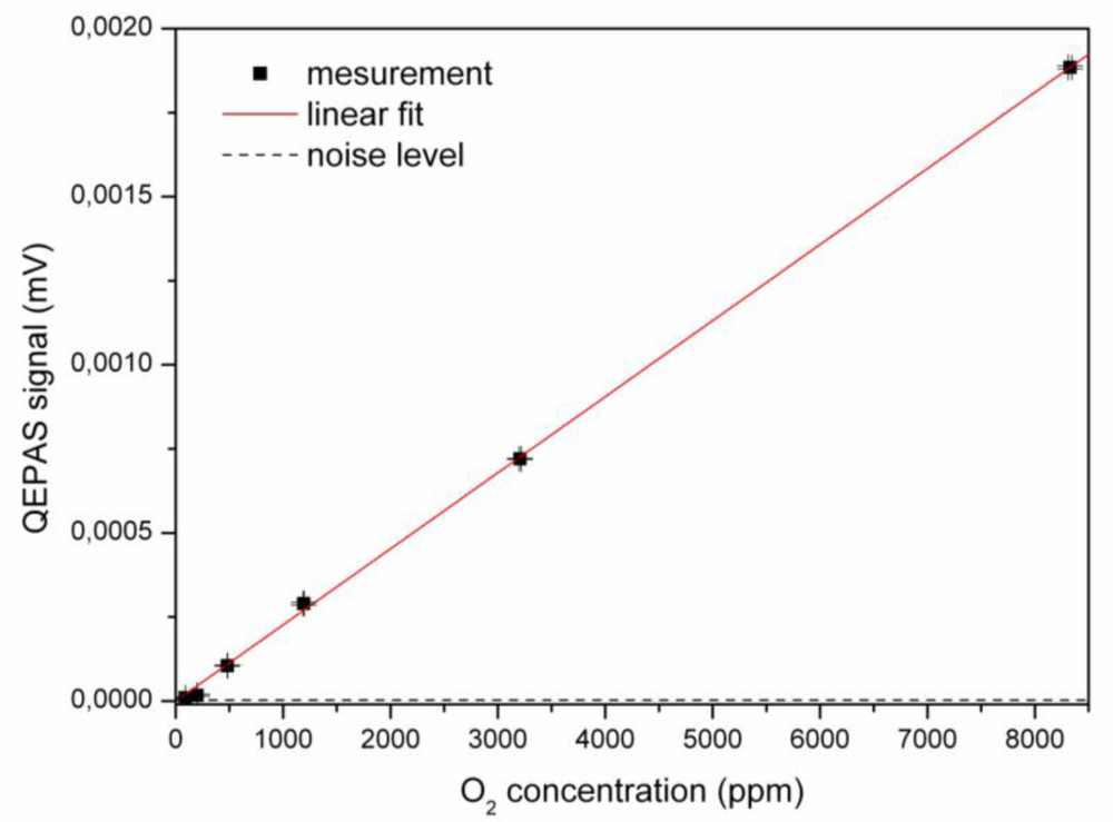 The dependence of the QEPAS signal on the oxygen concentration for measurements in this setup is shown in Figure 6. The points result from averaging 50 consecutive measurements, the error bars are the standard deviations. The pressure within the system was set to p = 210 mbar for technical reasons and deviates thus slightly from the optimum value for QEPAS. The lock-in amplifier settings were the same as those used for the experiments without the tapered amplifier (τ = 1 s, roll off 24 dB/oct). In this case, a detection limit of 13 ppm was found for oxygen (1 σ). The corresponding coefficient was 4.41·106 ppm/V and the noise level was determined to be 2.93 μV. These data were obtained at an optical power of P = 1228 mW. Accounting for the laser power used for excitation and the bandwidth of the detection system, this value leads to a power and bandwidth normalized noise equivalent absorption sensitivity (NEAS) of D = 4.74 × 10−7 cm−1 W/Hz1/2.