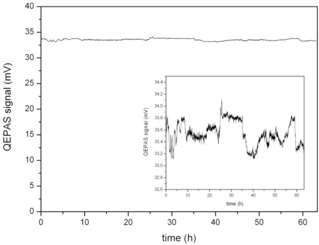 The dominant noise source for resonant measurements with quartz tuning forks is the thermal or Johnston noise of the tuning fork []. The noise caused by the tuning fork is therefore independent of the signal strength and the resolution for measurements of higher concentrations is determined by the noise floor, which also defines the detection limit. As the measurements with and without the tapered amplifier were done in different setups with two different spectrophones (consisting of tuning fork and acoustic resonator) the measurements are not directly comparable as the Q-factor of the tuning fork and the acoustic resonator both influence the signal amplitude and the noise level. The long-term stability of the system is tested by performing a measurement of the atmospheric oxygen concentration in an enclosed cell over more than 60 hours (Figure 7).