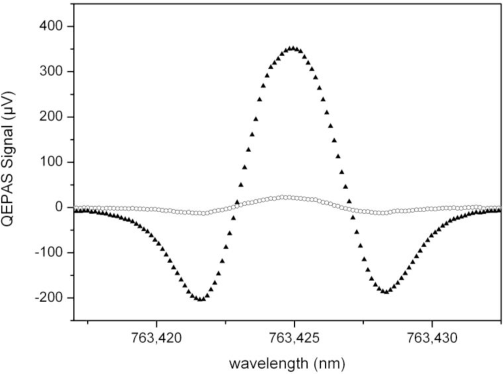 QEPAS measurements of ambient oxygen in air at p = 300 mbar. The graph shows the normalized 2f wavelength modulation signals measured without (circles) and with the tapered amplifier (triangles).