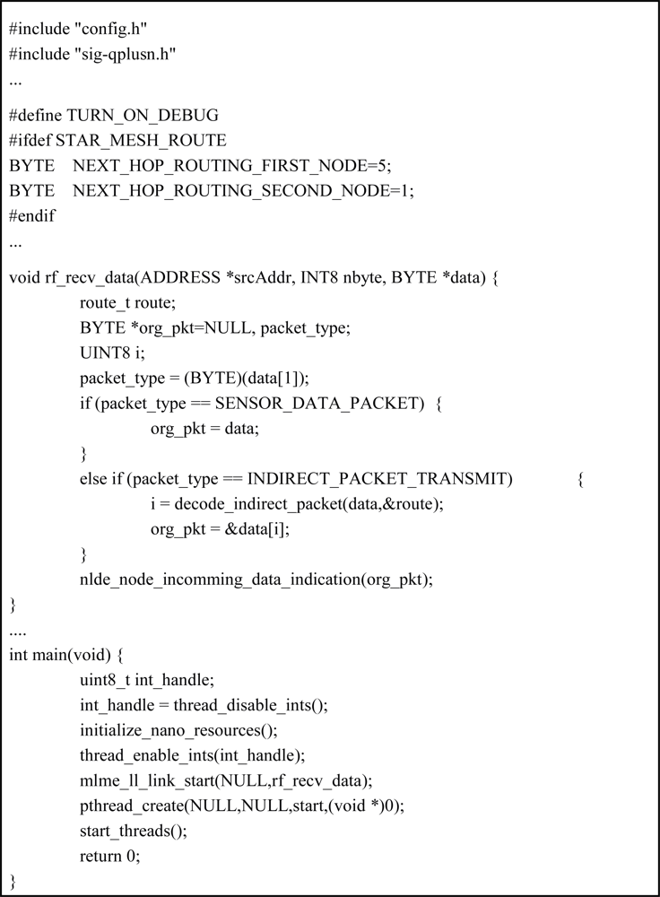 Figure 10 shows the automatically generated software codes for sink0 node. Sink0 node receives values of gas and light sensed by the sensor node and compares them with threshold values. If it determines on comparison that gas valve or light lamp needs to be operated, it transmits through router node actuation command to actuator node connected to gas valve or light lamp. Figure 10 is part of software codes implementing such operation, which shows module part that processes transmitted data and execution code part.