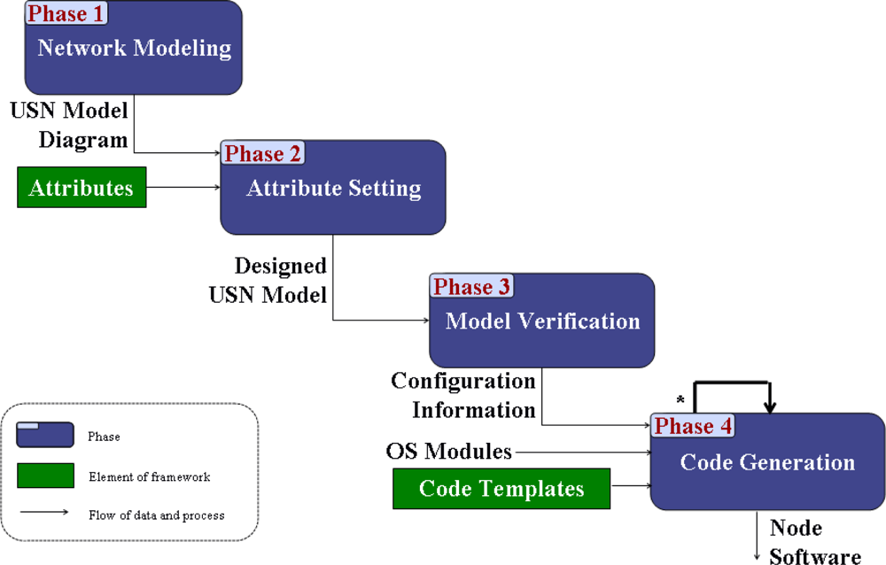 When our approach is used, node software for an application is designed by setting values of the predefined attributes and then source code for node software is automatically generated by composing code templates according to the values of these attributes. To support this application development technique, the USN application development framework should be established. Figure 1 presents the framework.