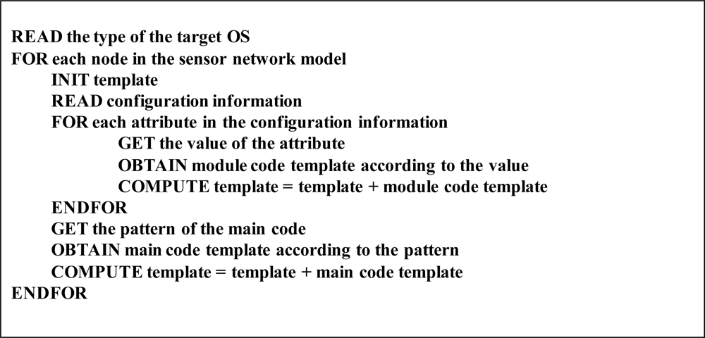 Figure 4 presents the algorithm for generating software source codes of each node. Configuration information is parsed in order to get the attribute values of a node and to select the operating system components that are necessary to generate the software. According to the values of attributes, module and execution code templates are selected from the Code Templates Repository and composed into the node software.