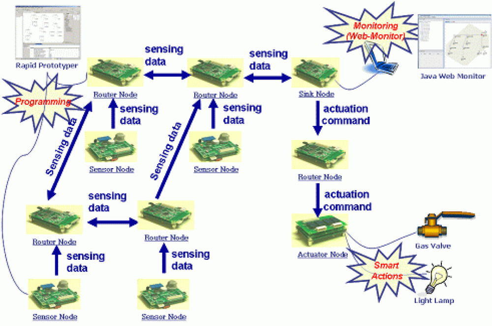 Our sample application consists of nodes which have roles such as gas and light sensor, router, sink and actuator. Sensor nodes sense gas and light data and transmit the sensing data to router nodes. The router nodes receive the data and transmit it to the sink node. The sink node aggregates the data, computes it, determines the action commands and transmits the commands to actuator nodes. The actuator nodes perform the actions, that is, the gas valve and the light lamp operate according to the actions. Figure 5 presents the structure of the G&LM System. The G&LM System is a simple environmental monitoring system, but it has all kinds of sensor nodes which are necessary for a sensor network. So, we think that it is possible to evaluate the proposed technique through the G&LM System.