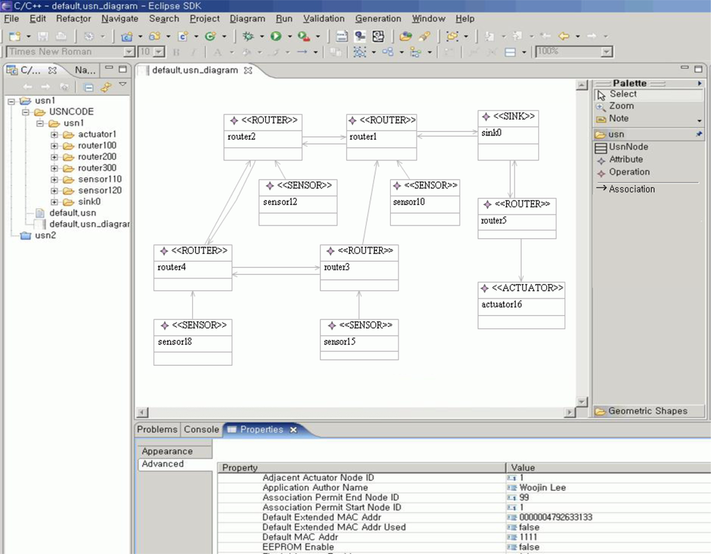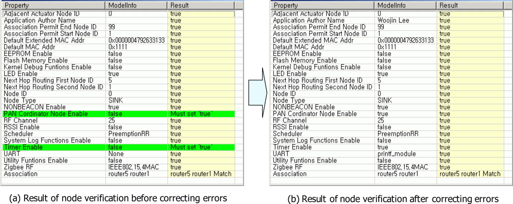 Figure 9 shows the result of node verification for sink0 node. Through the node verification, errors for each node in a USN model were found. Figure 9(a) shows two errors which were detected in node verification for sink0 node. Sink0 node should be PAN coordinator and it should use timer module. Accordingly, values of PAN_Cordinator_Node_Enable and Timer_Enable were set to ‘true’ in order to generate correct software codes for sink0 node. After correcting wrong values, all attribute values of sink0 node were appropriate [see Figure 9(b)].
