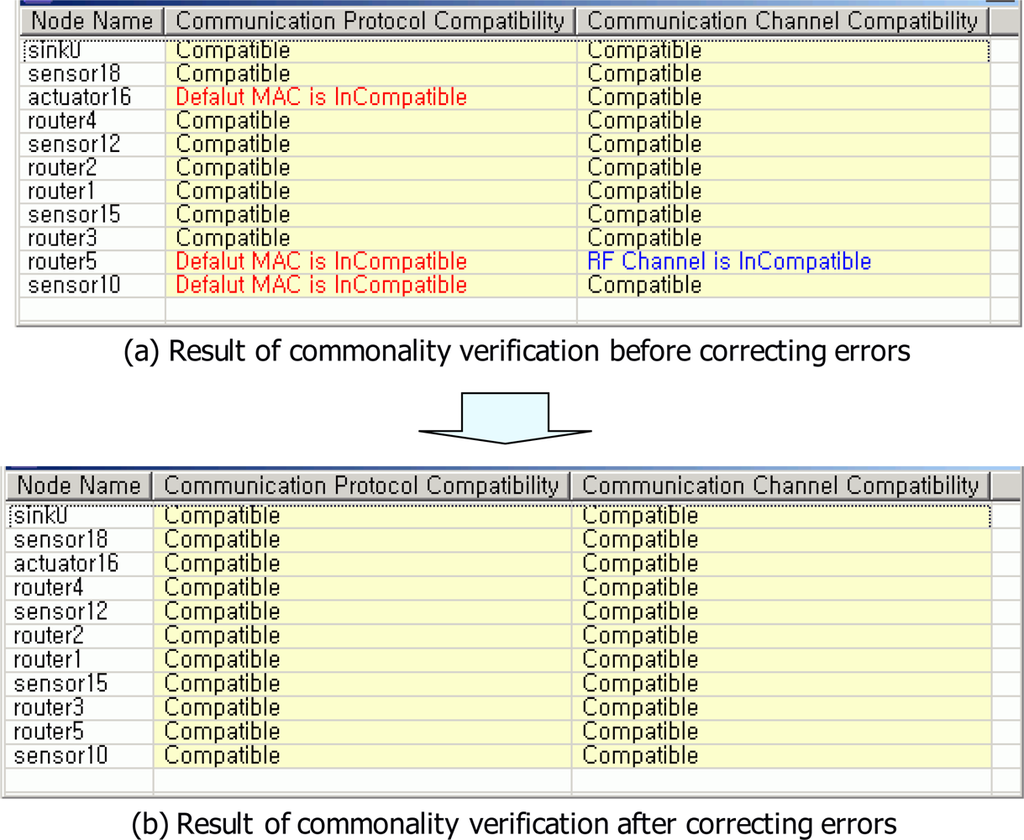Figure 7 shows the result of commonality verification. Through the commonality verification, errors for communication protocol and communication channel of a USN model were found. Figure 7(a) shows four errors which were detected in commonality verification. Communication protocols of actuator16, router5 and sensor10 nodes were not compatible because default MAC addresses of actuator16, router5 and sensor10 nodes were set to wrong value. Communication channel of router 5 node was also not compatible because the RF channel of router 5 node was set to a wrong value. Accordingly, default MAC addresses of actuator16, router5 and sensor10 nodes were set to proper values. RF channel of router 5 node also was set to proper value in order to generate correct application. After correcting wrong values, communication protocols and communication channels of nodes were compatible [see Figure 7(b)].
