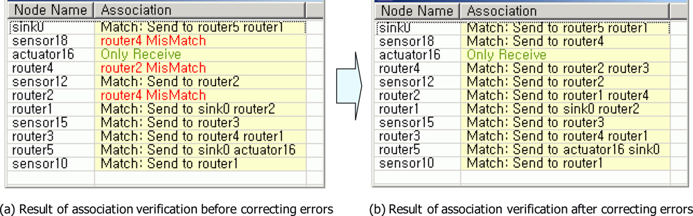 Figure 8 shows the result of association verification. Through the association verification, errors for associations between nodes in a USN model were found. Figure 8(a) shows two errors which were detected in the association verification. Figure 8(a) presents the mismatched associations. The association between sensor18 node and router4 node was mismatched. The association between router4 node and router2 node was also mismatched. Accordingly, the mismatched associations were corrected. After correcting the mismatched associations, there were no errors in associations between nodes [See Figure 8(b)]. That means routing path of the sensor network for light & gas monitoring application is correct.
