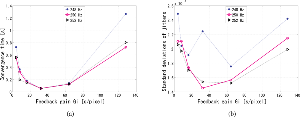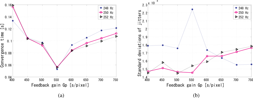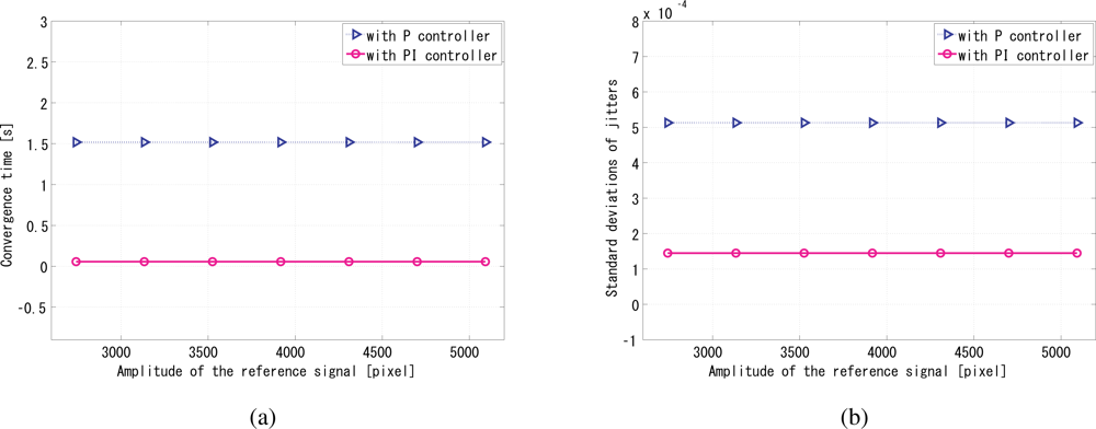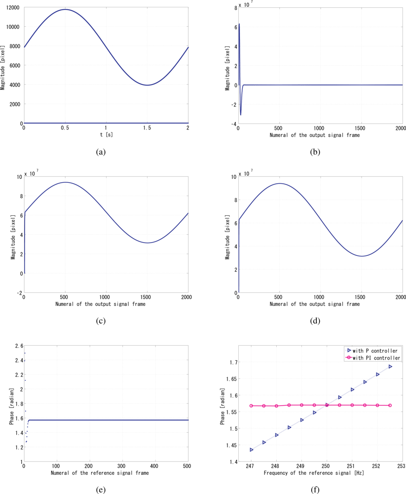 We also take into account the frequency mismatch between the oscillator that drives an illumination and the one that drives a vision sensor, by which the central frequency of the vision sensor does not strictly agree with quadruple of the frequency of reference signal. This mismatch causes steady-state residual phase error even in the locked state. In order to remove this error, a PI (proportional-integral) controller is applied to the negative feedback in Figure 9. Specifically, an integral term is added to Equation (8) as