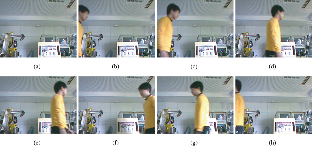 The real world scene whose brightness sequence is used as the envelope of the input for simulation, which assumes a surveillance scenario, (a) 0 s; (b) 1.523 s; (c) 1.749 s; (d) 2.259 s; (e) 2.578 s; (f) 4.916 s; (g) 5.415 s; (h) 6.179 s.