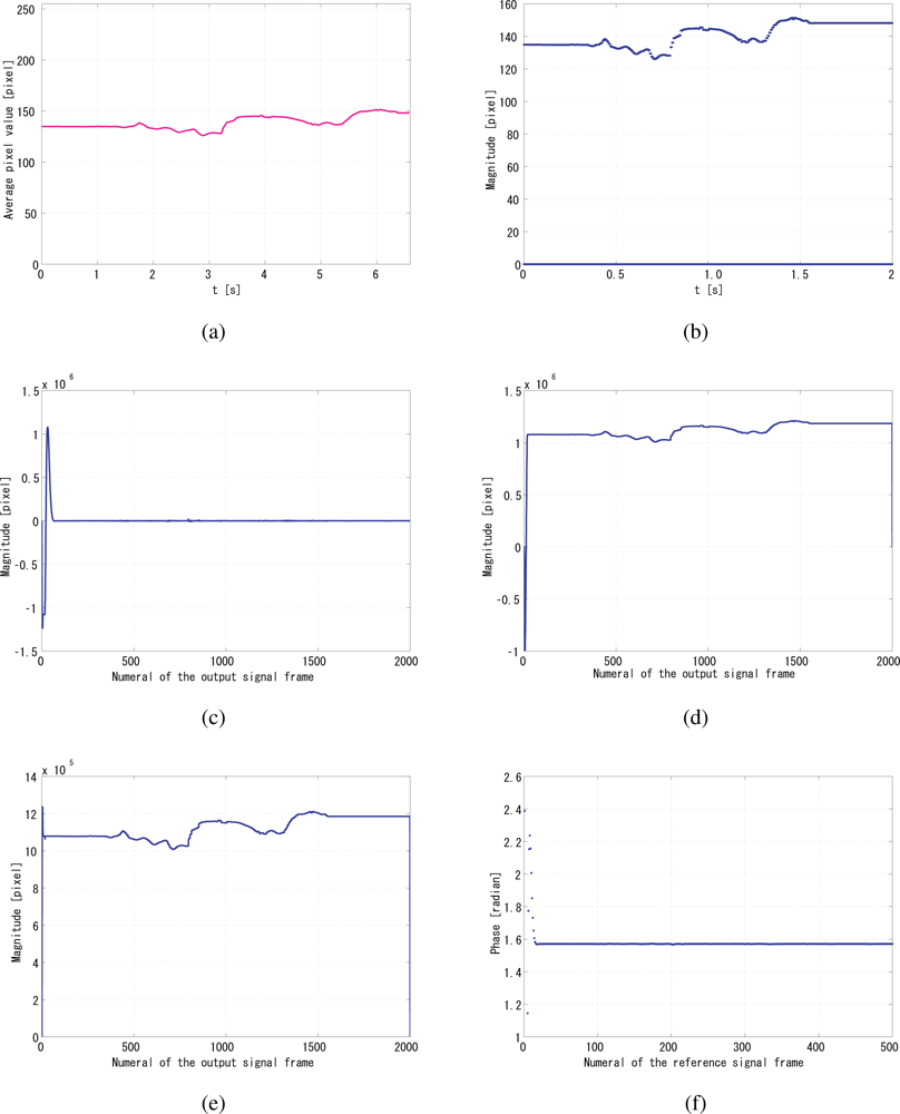 Figure 14 shows the snapshots of an indoor scene in which a person is walking around within the field of view of a camera (Logicool Qcam S 7500, 640 × 480 pixels, 30 Hz, 8 bits). The average of the pixel values within each frame is computed by the computer vision library OpenCV to obtain the average brightness sequence of the scene b(t), which is shown in Figure 15 (a). Note that the scene includes a large reflective moving region so that the average pixel values fluctuate randomly and abruptly. The reference signal f(t) for the simulations is generated from b(t) and the 250-Hz unity-amplitude square wave r(t) as f(t) = Nb(t)r(t), where N = 64 × 64 is the number of the pixels. This corresponds to the situation that all of the room light of this scene is replaced with the intensity-modulated illumination and no self-emissive light source exists.