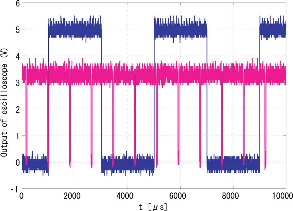 The operation of this high speed vision system was measured by observing the pixel reset signal of the imager, whose positive edge corresponds to the beginning of an integration period, by a Tektronics TDS3034 oscilloscope. If the operation of the vision system is locked to the illumination, synchronized waveforms of the pixel reset and the reference signal will be observed in the oscilloscope. The blue signal is the reference signal, while the yellow one locked to it is the output signal.