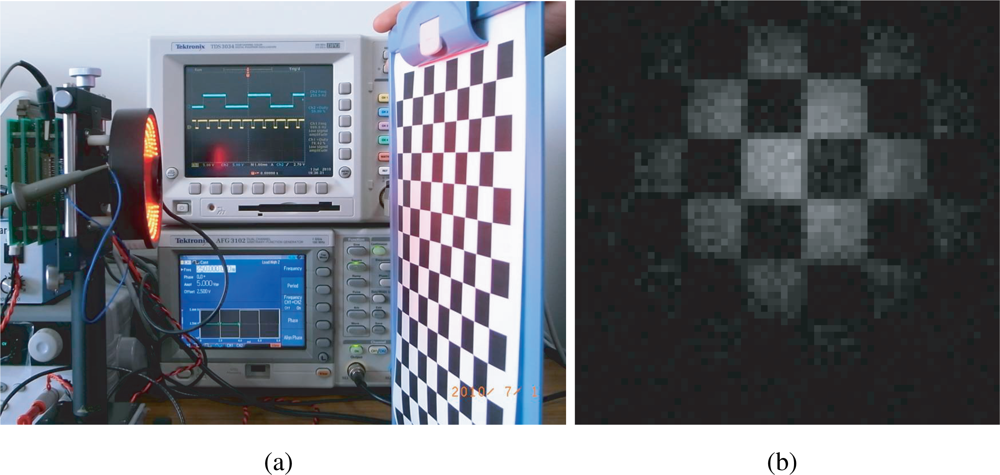 The experiment results are generalized in Table 1. When the synchronization is not successful due to inappropriate gains, although the vision chip can take real world images as usual in Figure 17, the spontaneously electronic shutters of the vision chip are not locked to the reference signal in Figure 18. More precisely, feedback control is not executed during the non-integration time. Items 2–6 describe the various successfully synchronized cases. The LED directly shed light on the vision system with a reflected gadget in a normal laboratory environment is shown in Figure 19 (a). The movement and the reflected light of the gadget before the lens do not disturb the synchronization at all. The illuminance measured in front of the imaging optics when the LED light is off was 187 lx, and was 3460 lx when the LED is on without intensity modulation. An image of the gadget taken by the vision system is shown in Figure 19 (b). When the reference signal is an indirect illumination, such as reflected light in Figure 20 (a), about 1068 lx, with free changes of direction the synchronization is also successful owing to the signal normalization algorithm. An image of the checkerboard taken by the synchronized vision chip is shown in Figure 20 (b). Actually, reflected light is the most common source of illumination. The upper limit of synchronization distance is 1 meter under 3460 lx. The LED brightness can be freely adjusted within the range from 142 lx to 3850 lx, corresponding to the changes of orientation of light source. Note that the imager used here has considerably low sensitivity and is noisy, and the background texture is almost unobservable. The average pixel value over both of the illuminated and unilluminating pixels during a 50-frames sequence was 18.4 with 0.053 standard deviation, while it was 0.8 with 0.036 standard deviation when the LED is off.