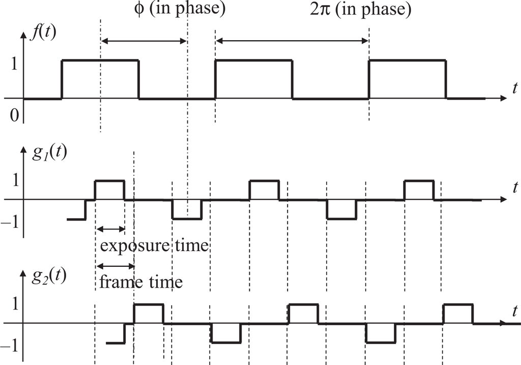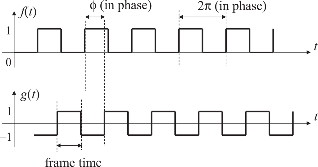 . The quadrature output signal g2(t), however, has to change its value in the midst of a frame and thus the stratagem shown in Equation (1) cannot be used. To avoid this situation, we change the ratio of the reference frequency and the frame rate from 1:2 to 1:4 so that a one-frame time shift on the vision sensor side corresponds to a 90-degree phase shift on the reference side.