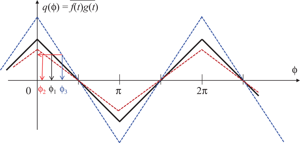 However, it has no adaptability to the changes of the reference signal amplitude L. Since the time correlation is proportional to L, information about L is required to design the feedback system appropriately. This situation is intuitively illustrated in Figure 4. The red and blue dashed lines show the cases with smaller or larger reference amplitudes than the black line case, respectively, but different phase differences ϕ1, ϕ2 and ϕ3 for these three cases yield the same time correlation value.