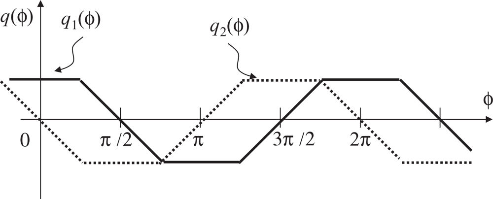 We address this issue by defining the output signal pair g1 and g2 as return-to-zero (RZ) line codes in Figure 5, which means that a separate clock does not need to be sent alongside the signal. One of the output signal g1(t) takes values 1, 0, −1, and 0 during the frames whose frame number mod 4 are equal to 0, 1, 2, and 3, respectively, and the other signal g2 takes 0, 1, 0, and −1 during the corresponding frames.