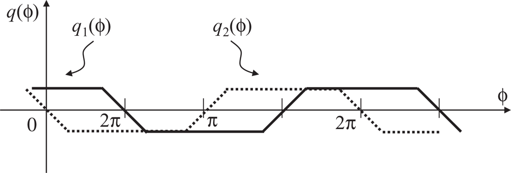 By adopting this definition, the system works well in the cases with shorter integration time. This is essentially because the rising and the falling edges of the reference signals are within integration periods when the system is in the locked state. The relation between the correlation values q1(ϕ), q2(ϕ) and the phase difference ϕ when we have a shorter integration period than the full frame time is shown in Figure 7. Clearly, in Figure 8 the correlation q1 is sensitive to the phase error at the locked state ϕ = π/2. The quantity for the normalization max(q1(ϕ), q2(ϕ)) still does not depend on ϕ and is proportional to the reference amplitude. It should be noted that max(q1(ϕ), q2(ϕ)) also depends on the length of the photo integration period. For reliable normalization, therefore, the length of the photo integration time of the vision sensor must be obtained, or at least it should be the same length as the one used when the feedback gain is designed. This is a reasonable assumption for a vision sensor whose frame time is controllable.