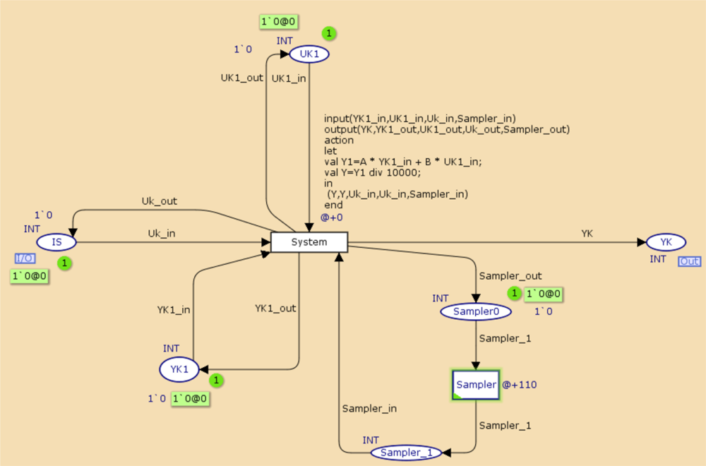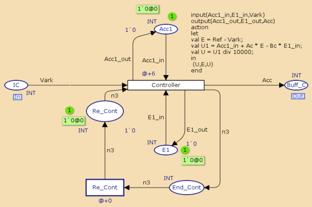 Figures 9 and 10 present the system model and the control task. In Figure 9, the System transition represents the system dynamics, which is sampled every 110 ms, and IS represents a zero-order hold for the input signal applied to the system. The controller transition in the controller task model represents the dynamics of the regulator.