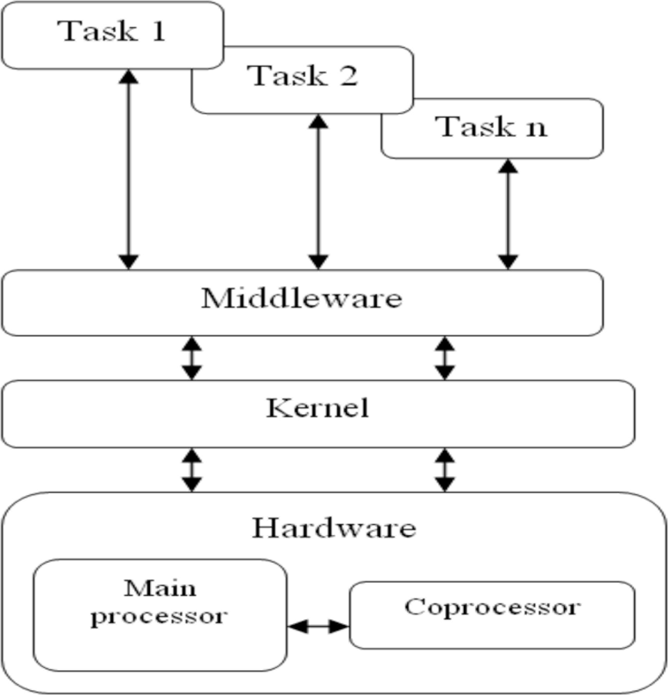 Middleware: receives requests from tasks to execute a predefined function, understanding it as a set of tasks with known computational requirements and constraints. The middleware then sends commands to the kernel, which based on a static voltage scaling algorithm, [23], sets the correct values of frequency and voltage to operate the processor and then selects the tasks to be executed by the kernel. In order to activate tasks for each application scenario and considering than in these applications the number of tasks unassigned to a specific node and its code is reduced, it is supposed that each node has a replica of every unassigned task which execute depending on the scenario of the system.