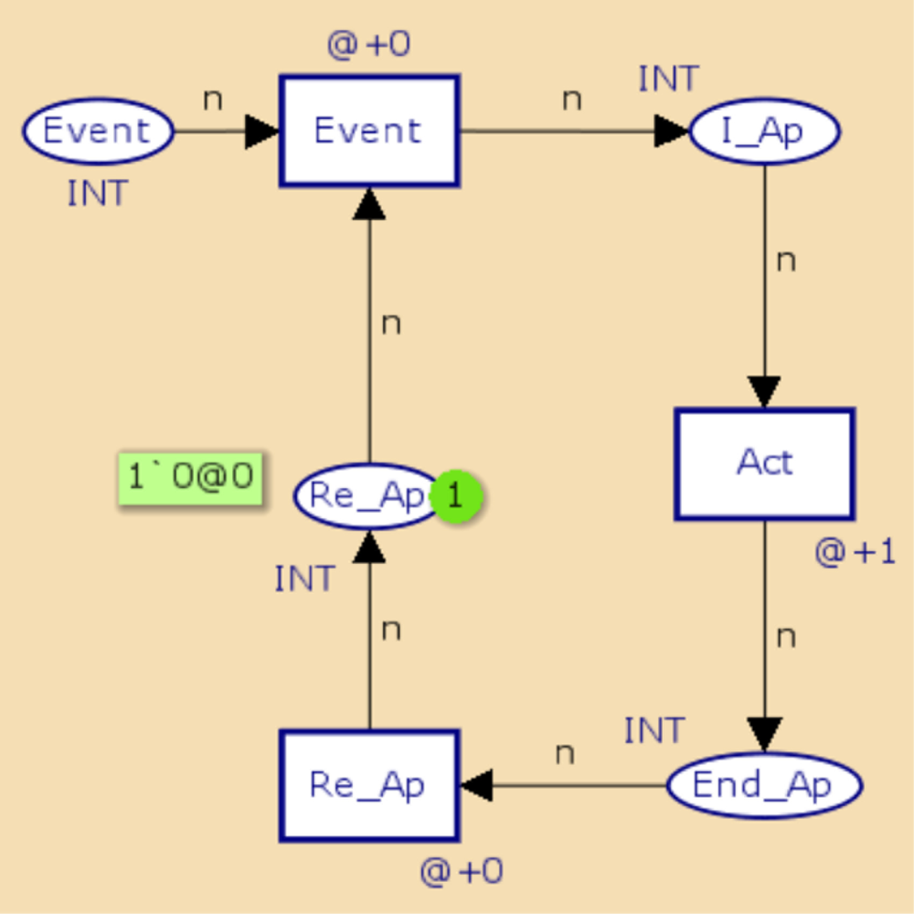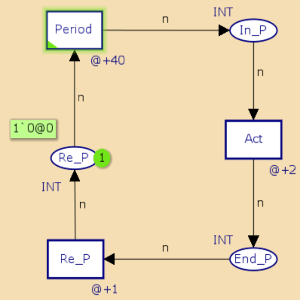 In the periodic object model, In P and End P represent the start and end states of the periodic activity, respectively, while the transition Act represents the development of the actions associated with the component. If necessary, more transitions can be placed to represent the development of the operations. The transition Re p and the place Re p indicate when the task is ready for a new implementation. Finally, the transition period indicates compliance of the implementation period of the component. The representation of the aperiodic component is very similar to the periodic component. Activation of the aperiodic component is performed by placing a mark at the site Event to generate the Event transition.