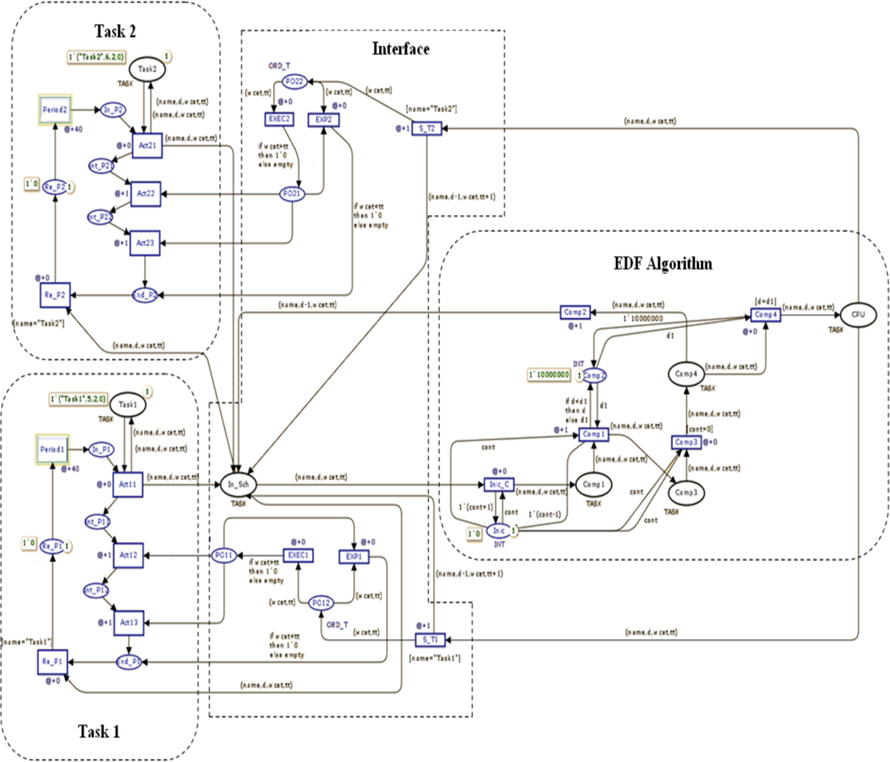 Figure 5 shows the CPN model of a scheduler EDF that uses an interface to interact with each task. This process indicates if it won the competition for the processor (place CPU), or when it has completed its execution. In this case, the implementation of two periodic tasks is presented. The marks on the tasks have 4 fields (name, d, WCET, tt), representing the name of the task, deadline, worst-case execution time, and the time that it has been executed by the processor.