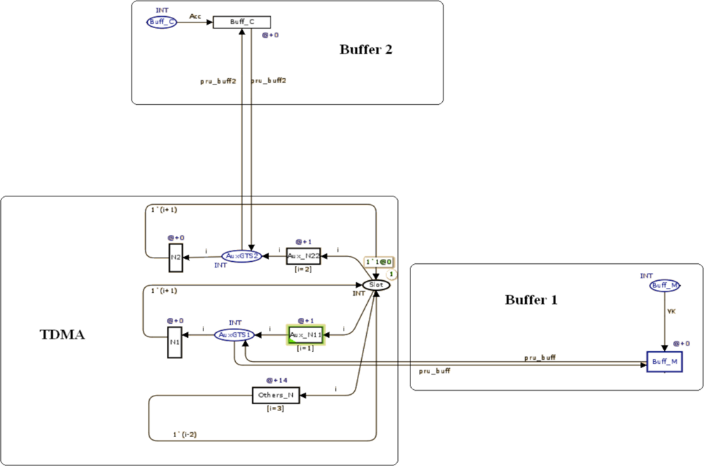 Figure 6 shows the TDMA network model with 35 slots and two GTS slots, 1 and 2, which are assigned to nodes 1 and 2, respectively. This model represents the super-frame behavior of IEEE 802.15.4. Buff-M and BuffC represent the entry points to the network node’s buffers. Buff M and Buff C transitions are activated at the time instant nodes 1 or 2 have any data to transmit and the network slot scheduling matches its respective GTS. IN Act and IC represent the node’s input buffer to which the information is addressed.