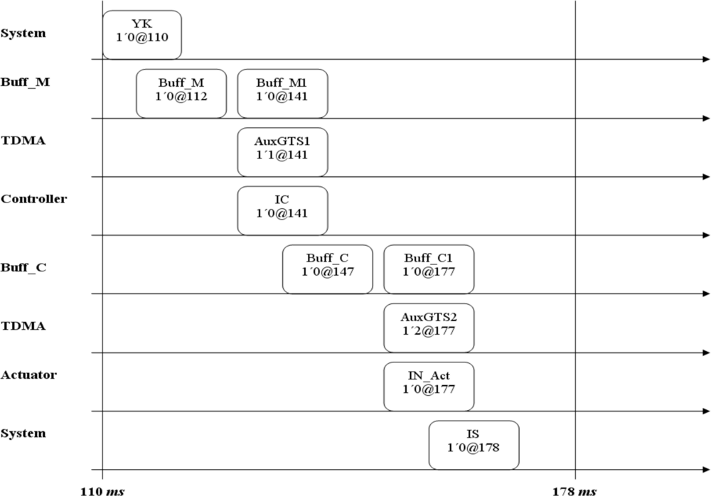 The approach is as follows. The control application requires three tasks. The measure is represented by a periodic component, while the controller and actuator are represented by aperiodic components, which are executed on different nodes. The model presented in Figure 6 was used to represent the communications network, which is comprised of two GTS: GTS1 sends measures and GTS2 sends control actions. In this case, task schedulers were not considered because each node execute a single component. Figure 8 shows the sequence of events generated in the simulation of the case study. It can be seen that the delay generated from the moment when the simulation started until the moment the actuator acted was 68 ms, then deadline requirements were fulfilled.