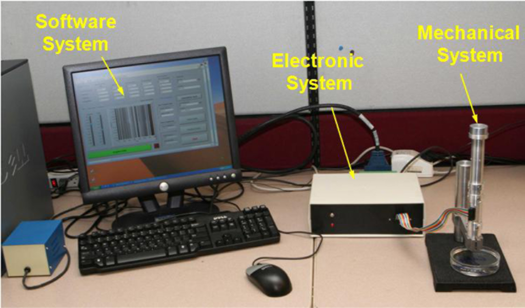 With respect to the measurement, the excitation signal, a pseudo random binary signal (PRBS) which provides better crest factor, is produced by the software system. The signal then passes through the electronic system and gets amplified. The amplified signal is then applied to a voice coil actuator inside the mechanical system. This produces motion in the indenter tip of the device to excite the attached tissue with extremely small amplitude. The system responses, including the linear displacement of mass m1, the acceleration of mass m2, and the force felt by the tissue, are picked up by a LVDT sensor, a MEMS accelerometer, and a miniature force sensor inside the mechanical system respectively. The data picked up by the sensors is then sent back to the software system after passing through an anti-aliasing filter and a band pass filter in the electronic system. With these data, the shift in the natural frequencies and damping ratios of the device can be acquired by using LabView.