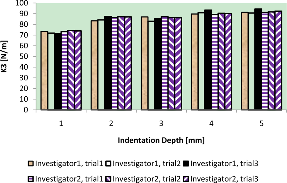 These figures show how TRID measurements of static stiffness k3, dynamic stiffness k4, and damping c of the silicone gel sample change with respect to different trials and investigators. For static stiffness k3, intraclass correlation coefficient (ICC) of investigator 1 is 0.95, ICC of investigator 2 is 0.99, and ICC for inter-rater reliability is 0.96. For dynamic stiffness k4, ICC of investigator 1 is 0.99, ICC of investigator 2 is 0.99, and ICC for inter-rater reliability is 0.99. For damping c, ICC of investigator 1 is 0.98, ICC of investigator 2 is 0.99, and ICC for inter-rater reliability is 0.97. All these indicate high reproducibility of TRID’s measurements between trials and investigators.
