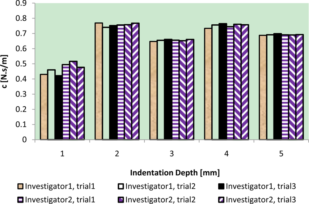 Apparently, the reliability of TRID is crucial as a potential clinical apparatus. The first issue is that the measurement result variety of a soft tissue sample should be within a reasonable range with respect to TRID measurements with different users. Another issue is that the TRID measurement result of a soft tissue sample with the same user should be repeatable. With respect to the potential applications of TRID for in-vivo measurements, the indenter misalignment will occur definitely, which means the indenter of TRID is not perpendicular to the surface of soft tissues under study. Thus the experimental study of TRID’s reliability with respect to inter-reliability, intra-reliability, and the indenter misalignment effect is performed.
