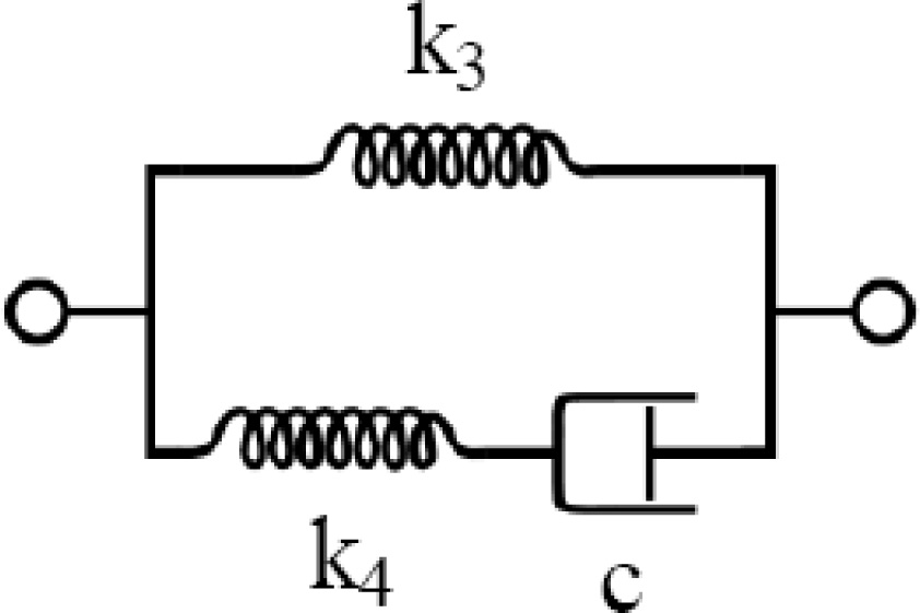 Given the limitations of existing devices, a new portable device, called Tissue Resonator Indenter Device (TRID), has been designed and prototyped at the Bio-instrument and Biomechanics Lab of the University of Toronto for measuring regional viscoelastic properties of soft tissues in the range of 0–100 Hz [14]. The device is an evolved and completely redesigned version of the idea proposed in [15] and [16]. The overall view of the experiments using TRID can be seen in Figure 1. This device has three main parts: the mechanical system, the electronic system, and the software system installed in a computer. The mechanical properties of soft tissues can be determined by exploiting the fact that they both exhibit springiness (i.e., have stiffness) and dissipative character (i.e., have damping). If an external system with known natural frequencies and damping ratios comes into contact with a soft tissue under study, a shift will be observed in its natural frequencies and its damping ratios will increase. This simple idea is the underlying principle based on which TRID works. For this work, the mechanical system of TRID consists of two springs and masses that are connected back to back to produce a two-degrees-of-freedom system with known natural frequencies and damping ratios, which is shown in Figure 2. When a soft tissue, which is assumed as a Kelvin model [17], comes into contact with the indenter tip of the device, its viscoelastic properties will be felt through the shift in the natural frequencies and damping ratios of the device. Figure 3 shows the Kelvin model which is used to model viscoelastic materials. By providing accurate stress relaxation and creep characteristics, this model can be used to model the viscoelastic soft tissue and thereby calculate the creep and stress relaxation modulus. The three parameters of Kelvin model are the static stiffness k3, dynamic stiffness k4, and damping c of soft tissues. By obtaining the three unknown tissue parameters, the creep and relaxation modulus quantifying the viscoelastic tissue material can be found. The creep and stress relaxation modulus along with the relaxation and retardation times can be extracted via the mechanical components of the Kelvin model. The relaxation modulus is then given by: