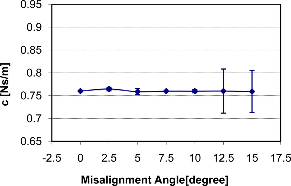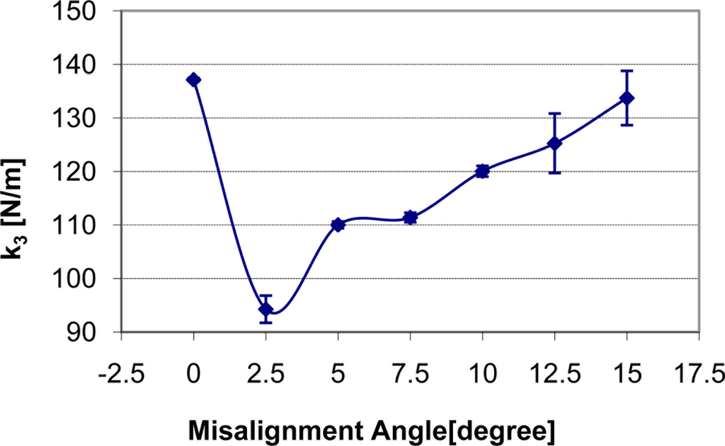 How the change of misalignment angle affects static stiffness k3, dynamic stiffness k4, and damping c of the silicone gel sample with input signal amplitude of 0.5 V is shown in Figures 7–9 respectively. With respect to the misalignment experimental results, there are apparent fluctuations in the values of static stiffness with varying off-perpendicular contact angles. The main cause of this phenomenon is the friction between the indenter of TRID and its bearing. Figure 7 shows that the friction has the biggest effect on experimental results with misalignment angle 2.5 degree. However, the values of the dynamic stiffness and the damping for varying off-perpendicular contact angles ranging from 0 degree to 15 degree have remained approximately constant. This means that the dynamic measurement method of the TRID has advantages for measurement with varying off perpendicular contact angles compared with the static measurement method of other devices. However, this reliability investigation was performed with silicone gel samples which are homogeneous and isotropic. If it were performed with real soft tissues, which are non-homogeneous and/or anisotropic, the results would be different. Therefore, the reliability investigation should be performed with real tissues such as animal organs or muscles in the future before TRID will be developed into a reliable clinical application tool.