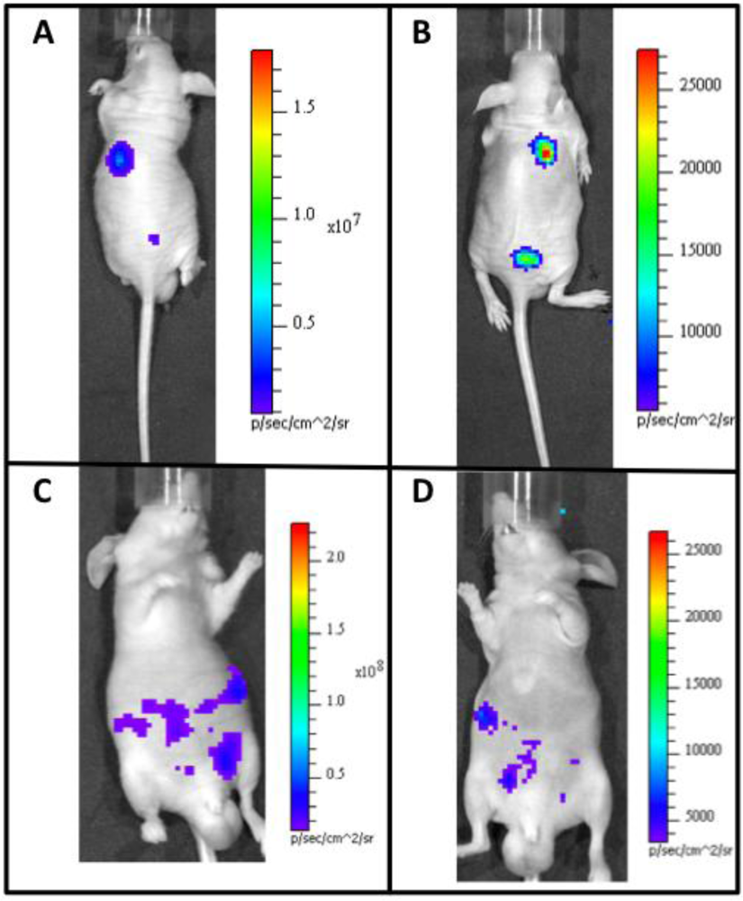Subcutaneous injection can be used as an alternative to intraperitoneal injection while avoiding the signal attenuation shortcomings of the intravenous injection route. It has previously been demonstrated by Bryant et al. [30] that repeated subcutaneous injection of luciferin can provide a simple and accurate model for monitoring brain tumor growth in rats. It has also been demonstrated that the repeated subcutaneous injection of D-luciferin or coelenterazine into an animal model results in minimal injection site damage and can provide researchers with bioluminescent signals that correlate well with intraperitoneal substrate injection luminescent profiles, albeit with a longer lag time prior to reaching tumor models in the intraperitoneal space [26].