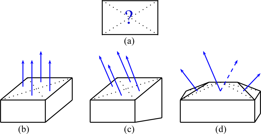 As previously mentioned, several approaches for 3D reconstruction of polyhedral building models currently employ as input Digital Surface Models (see Figure 2(b)). The classical DSMs are usually generated from calibrated aerial images by a multi-correlation based optimization process such as the graph cut optimization. The DSMs (derived data) are generally maps comprising only one value of altitude z for each ground location (x, y). These 2.5D maps can be considered as special 3D point clouds. However, the obtained 3D surface does not accurately model the physical surface especially at height discontinuities such as at roof and superstructure boundaries due to the correlation criterion used. Hence, the DSMs provide an approximated geometrical description of building surfaces and can be noisy. Other modeling approaches employ multi-source data, for example optical images combined with LIDAR data (e.g., [16]). Although less dense, LIDAR data can be employed in place of DSMs since they are both accurate (e.g., [913]).