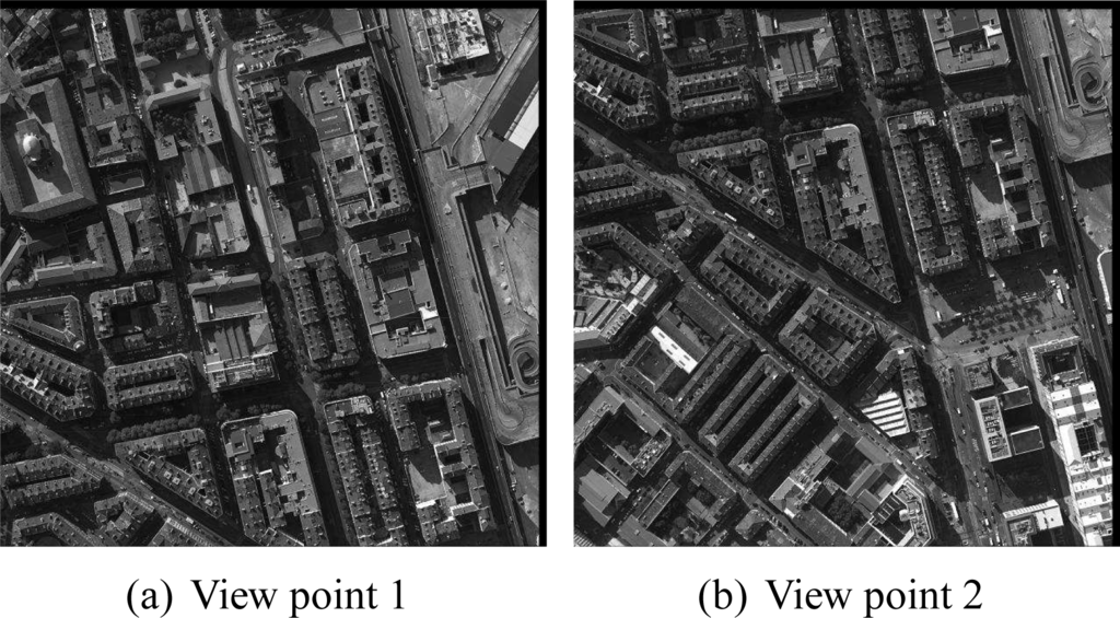 The input data are calibrated aerial images. Hence, our research deals with the intermediary degree of generic modeling such as described in Figure 1(b). In our case, the proposed approach can be considered as a top-down scheme (model driven) in the sense that a library of parametric building models is employed. However, our top-down approach is not conventional in the sense that the 3D model estimation is direct and only uses image rawbrightness. Moreover, the exhaustive search for the best model is avoided. The proposed approach employs aerial images as illustrated in Figure 2(a). The building footprint (focus area) is selected by an operator in one aerial image. The building footprint could also be retrieved from a cadastral map (existing 2D map of building footprints) [1,47]. In this case, the 2D footprint is expressed in a georeferenced world coordinate system.