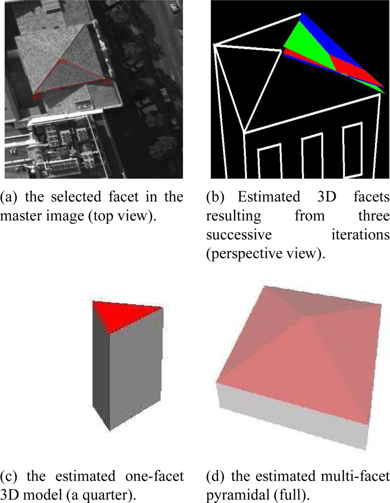 Figure 10. (a) Building footprint initially selected. No prior knowledge of the model shape is known. (b) Estimated prismatic model (algorithm initialization). (c) Estimated one-facet model (sloped roof). (d) Estimated multi-facet model (hip roof).