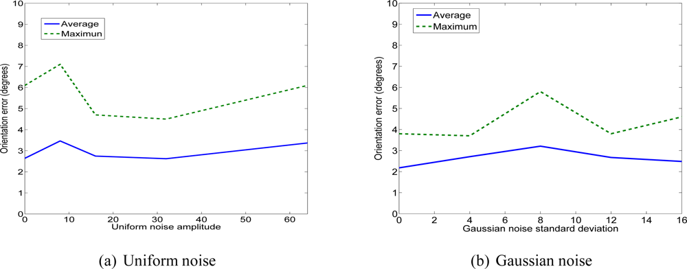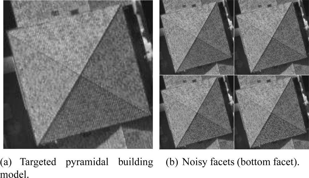 Figure 16. Adding noise to a facet for robustness evaluation. The intensities of the gray-scale pixels belong to the interval [0,255]. The magnitude 𝒨 of the uniform noise progressively increases according to the respective intervals 𝒨1 = [−4, 4], 𝒨2 = [−8, 8], 𝒨3 = [−16, 16] and 𝒨4 = [−32, 32]. These four levels of noise are shown in (b) (the corresponding random noise affected the bottom facet).