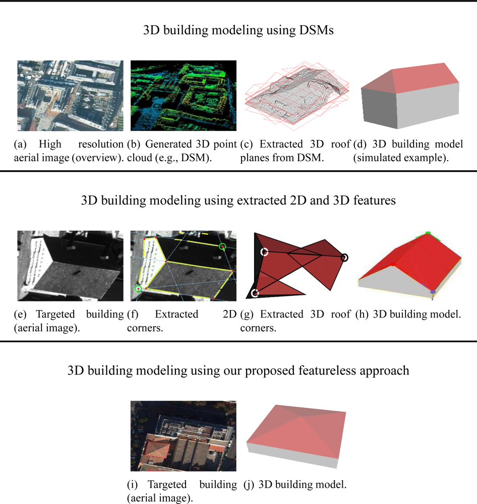 Figure 2. The upper part of this figure illustrates an example of 3D building modeling process using a DSM. The middle part of this figure shows image-based feature extraction and assembly. The lower part shows our proposed direct and featureless image-based approach. Figure 2(c) is retrieved from [1]. Figures 2(e), 2(f), 2(g) and 2(h) are retrieved from [3].