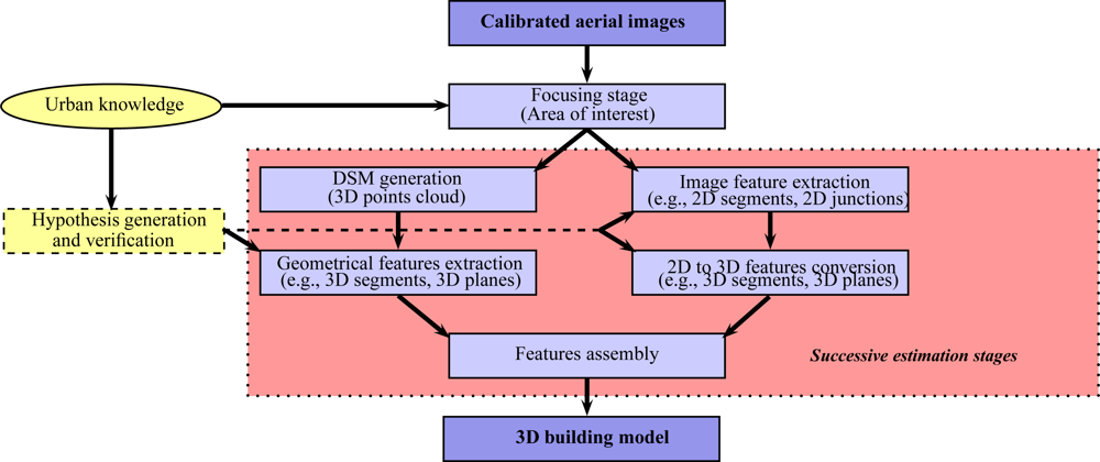 The rest of the paper is organized as follows. Section 2 describes various existing image-based approaches for 3D polyhedral building modeling. Section 3 presents the global strategy of the proposed approach. Section 4 describes the optimization process of the approach. Section 5 gives several intermediary results and evaluations of major steps.