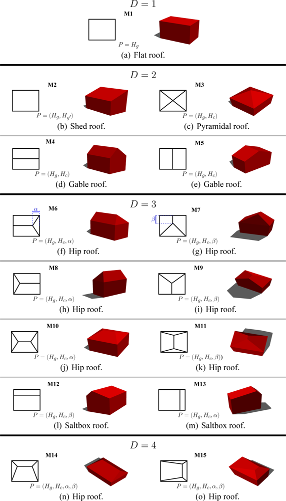 Figure 5. Samples of parametric building models M that can be reconstructed by our proposed featureless approach. Standard polyhedral shapes and their corresponding ground footprints are shown. D corresponds to the number of parameters. P denotes the model parameters. Hg and Hc correspond to the gutter height and the central line height. α and β respectively represent the horizontal and vertical recess as illustrated in blue.
