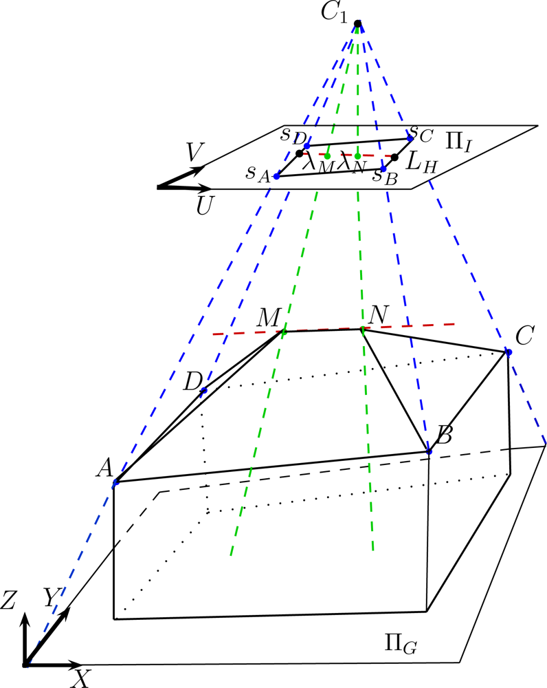 Figure 6. The adopted generic 3D polyhedral model. The multi-facet model (i.e., deformable model) is parameterized by Equation (3). sA, sB, sC, sD correspond to the footprint vertices selected in the image plane ΠI (master image). λM and λN correspond to the linear coordinates of the inner vertices M and N (unknown) along the detected Hough line LH. C1 corresponds to the center of projection of camera 1. Blue and green lines are outer and inner lines of sight (perspective lines), respectively. ΠG represents the ground plane in a geo-referenced world coordinate system.