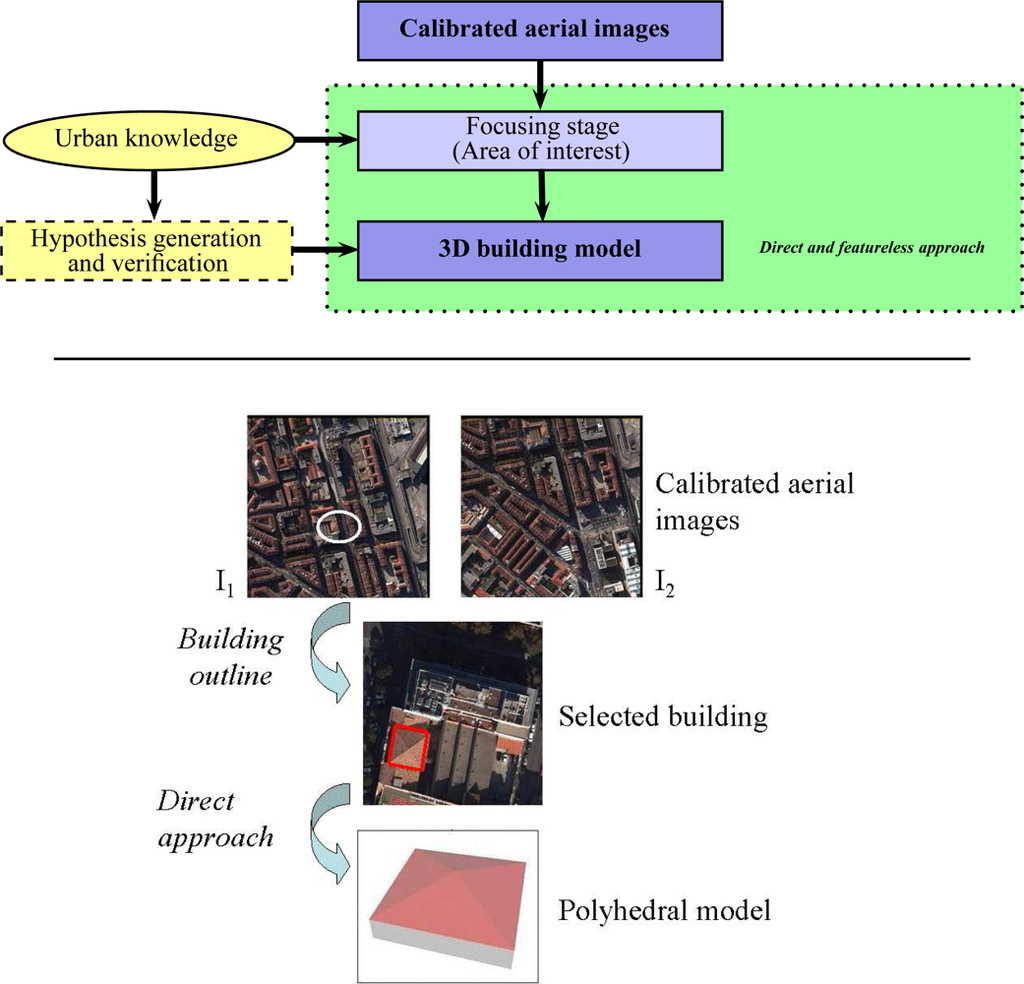 In this study, we present a novel modeling approach which is direct and image-based. The challenge consists in the reconstruction of 3D polyhedral building shapes using directly photometric information of aerial images. In computer vision, direct approaches have been essentially proposed for the image registration in order to generate mosaic images. Featureless image registration techniques strive to compute the global motion of the brightness pattern (e.g., affine or homographic transforms) without using matched features (e.g., [20]). We were inspired by this kind of approach and we propose a direct method for 3D building reconstruction. The flowchart diagram of the proposed approach is depicted in Figure 7.