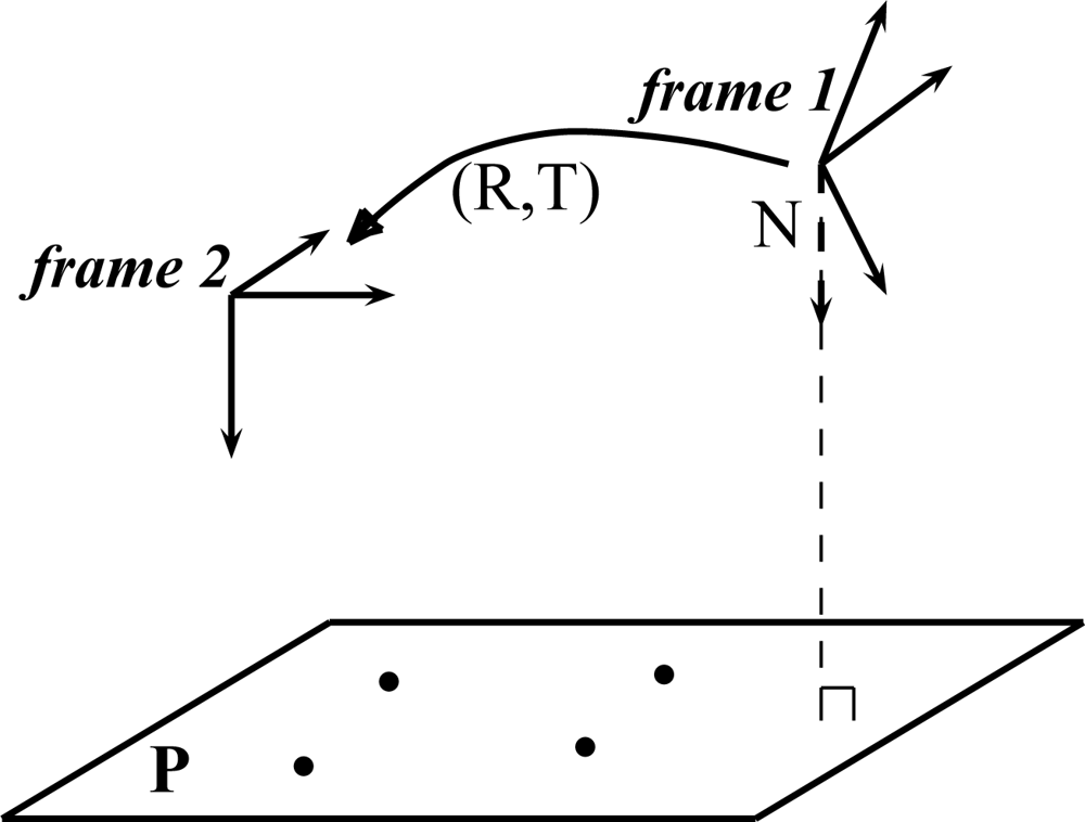 where the matrix K1 and K2 respectively are the intrinsic matrix of the two cameras, R represents the rotation, T represents the translation vector (R and T represent the motion between the two cameras), N and d represent the parameters of the plane in the camera 1.